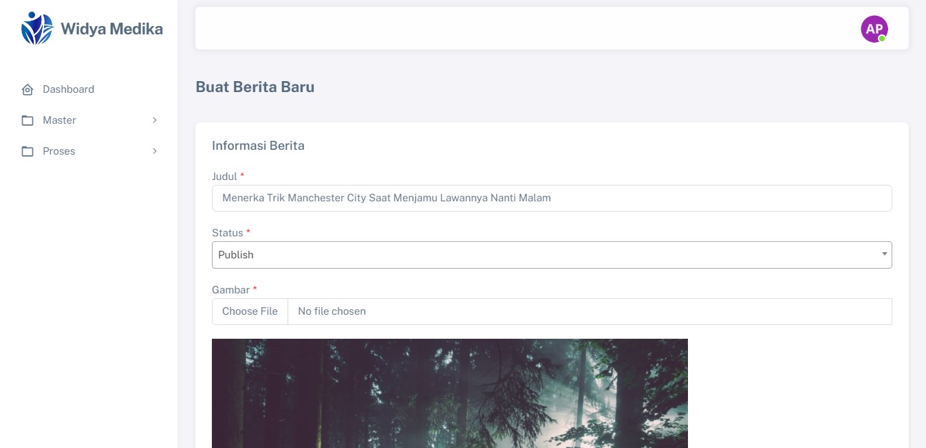 Halaman CMS untuk mengatur tampilan website Widya Medika. Ada juga fitur untuk membuat berita, mengedit berita dan menghapus berita. Selain itu ada juga halaman setting untuk mengatur banner website dan juga link sosial media.
